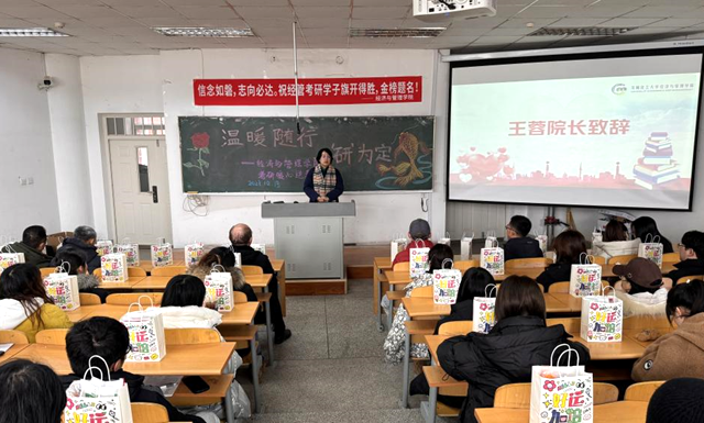 2024年考研征程已进入冲刺阶段,为鼓舞考研学子士气,增强考研信心,鼓励同学们在最后阶段做好充分准备,12月13日中午,经济与管理学院在瑞师楼118举办了考研暖心送考活动,为考研学子送上温暖祝福。学院领导班子及全体辅导员出席活动,本次活动由辅导员张国平老师主持。