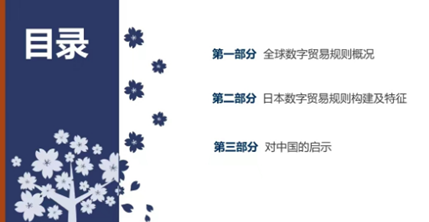 党的二十大报告中提出,“推动货物贸易优化升级,创新服务贸易发展机制,发展数字贸易,加快建设贸易强国”。日本在电子商务领域的发展领先全球,其数字贸易规则的构建具有先进性和示范性特征,为全球数字贸易发展提供了可借鉴的经验及教训。基于此,施院长从全球视角出发,首先详细梳理了全球数字贸易规则概况,继而重点分析了日本数字贸易规则的构建特征,接着基于中国数字贸易规则构建现状阐述了对我国的启示。包括中国应充分利用现有FTA网络加强与缔约对象的数字贸易合作,构建数字贸易发展基础;中国应在FTA谈判中积极引入数字贸易条款,增加数字贸易规则议题;中国现阶段可考虑导入 “ 东亚模板”推进与发展中国家的数字贸易合作,实现互利共赢。