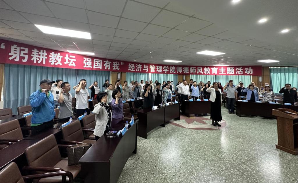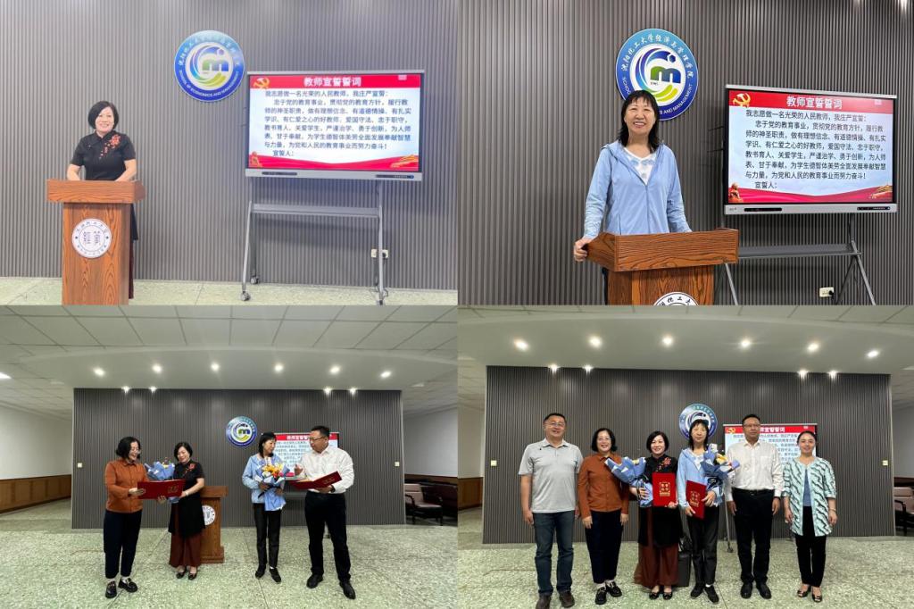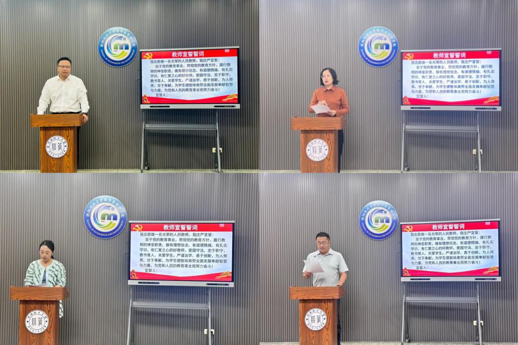 学院每年举行一次全体教师师德师风宣誓。本次会上,青年教师苗蕴慧副教授领誓,全体教师集体宣誓,声音响亮、庄重热烈,表达了教师听党话、跟党走,牢记人民教师的光荣职责和初心使命,为党育人、为国育才的坚定信念和决心。