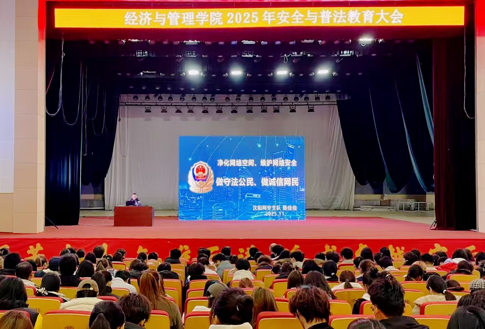 为全面提升师生安全防范意识与法治观念,努力营造安全、稳定、清朗的校园环境,世俱杯官方网站于11月4日在大学生活动中心成功举办2025年安全与普法教育大会。学院党委书记李丙文、沈阳市公安局网络安全保卫支队警官陈佳佳、学校保卫处相关负责人以及学院本科、研究生等1000余名师生代表出席会议。