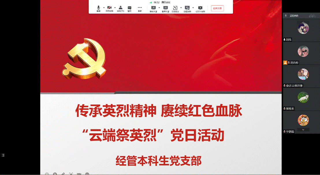 为深入传承弘扬英烈事迹和精神,引导学生党员传承弘扬革命先烈的优秀品质,引领崇尚、缅怀、学习、捍卫英烈的风尚,经管本科生党支部于4月6日18:00通过线上党员大会形式开展以“传承英烈精神 赓续红色血脉”为主题的“云端祭英烈”党日活动。