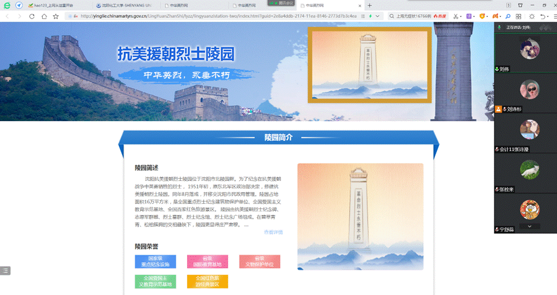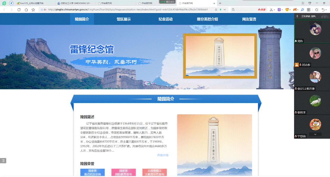 通过访问中华英烈网,带领支部党员了解烈士纪念设施地图,重点访问了辽宁省国家级和省级重点烈士纪念设施。党支部书记刘伟老师为全体党员详细介绍了抗美援朝烈士陵园、辽沈战役烈士陵园、雷锋纪念馆等爱国主义教育基地,叮嘱青年学生要铭记革命先烈的英雄事迹,弘扬爱国主义精神,多到爱国主义教育基地进行参观学习,为自己进行精神洗礼。