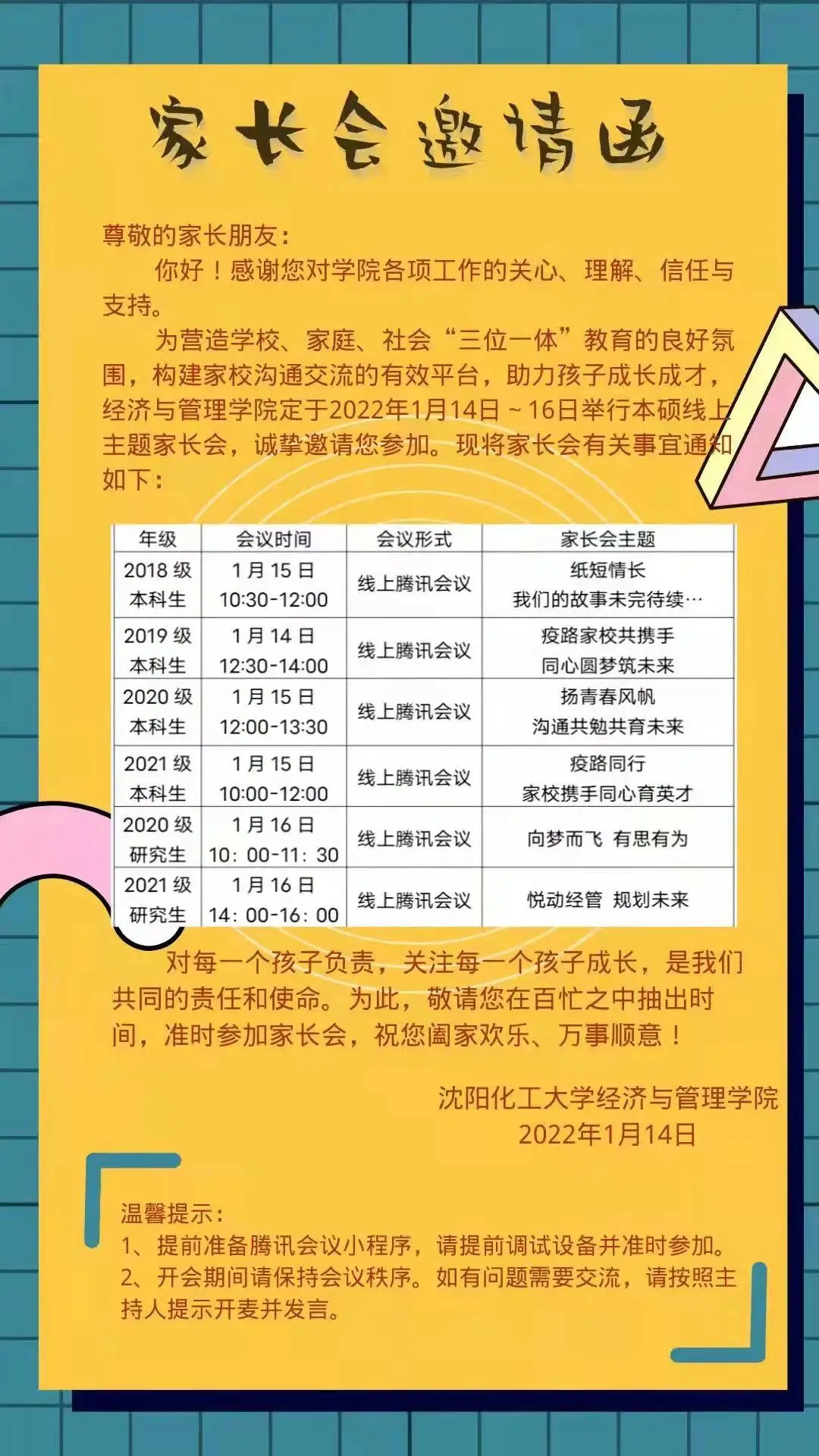 为进一步加强家校沟通,促进家校合作,2022年1月14日至16日,沈阳化工大学世俱杯官方网站线上主题家长会正式开启,全国各地的1460个家庭,通过互联网齐聚“云”端。本次家长会由学院统一部署,制定线上家长会方案,突出年级和阶段特点,精心策划会议内容。