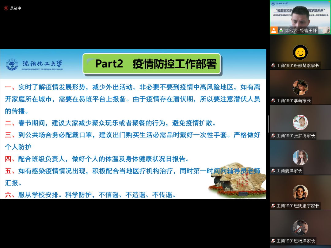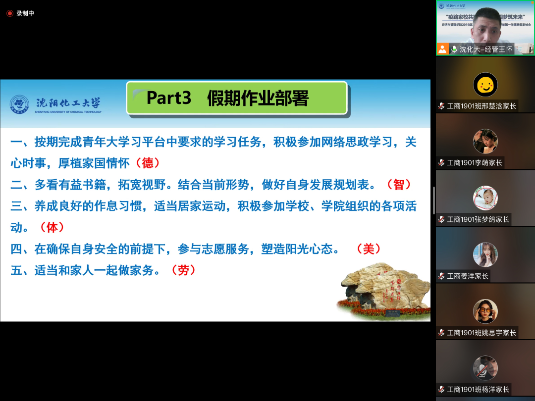 2021级新生入学刚满一学期,再次与家长网络相聚,倍感亲切。辅导员刘伟老师首先为家长介绍了2021级学生在校学习、生活情况,分享了孩子们的成长瞬间,着重强调疫情防护和假期安全。他动员学生,寒假期间,要积极参加家乡的社会实践活动,积极参加体育锻炼,注意防盗防骗等。会后,家长们纷纷在家长群内自发地分享对学校、学院、老师的感激之言。